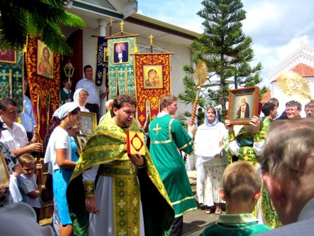 Особую торжественность празднику придавало то, что служили сегодня настоятели трех русских православных церквей Брисбена. Это настоятель Владимирской иконы Божией Матери отец Михаил Клебанский, настоятель Свято – Серафимовской церкви отец Гавриил Лапардин и настоятель церкви Благовещения отец Иоан Вир. После литургии верующие прошли вокруг храма крестным ходом. Хоры трех церквей сегодня тоже объединились и голоса певцов звучали особенно торжественно, придавая престольному празднику Божественную красоту. Зеленые облачения духовенства и алтарников насыщали праздник Боголепьем и жизнеутверждающе сочетались с благоухающей природой зеленого континента.