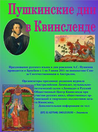 Редакция журнала «Австралийская лампада», Русский Общественный Центр Квинсленда приглашают на праздник, посвященный Дню Рождения А.С. Пушкина.