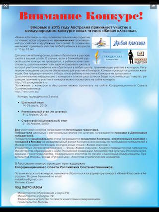 В день Всемирной поэзии 21 марта 2015 в штате Квинсленд, в Свято-Серафимовской приходской школе города Брисбена состоялся конкурс чтецов, следуя всем требования положения конкурса «Живая классика». Во время выступлений конкурсанты могли использовать музыкальное сопровождение, декорации, костюмы.