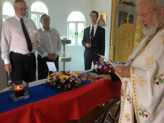 Через два месяца после кончины, 30 ноября 2015 новопреставленного отпели по православным традициям в сербской церкви святого Саввы в Дарвине. (Русской церкви в тех краях нет из-за малочисленного населения русских). Совершил отпевание митрофорный протоиерей Михаил Протопопов, прилетевший из штата Виктория. На отпевание правнука Российского императора Александра III собралось около 45 человек, включая, сербскую, греческую общины и журналистов. Правительство Северной территории Австралии представлял министр Культуры и Этнических дел Питер Стайлс. Из Канберры прилетел член дипломатического состава посольства Российской Федерации в Австралии Максим Валерьевич Раку. Организационными вопросами похорон занимался бывший член Совета Российских Соотечественников в Австралии Семён Андропов, проживающий в Дарвине. Гроб по традиции покрыли Российским гербовым флагом.