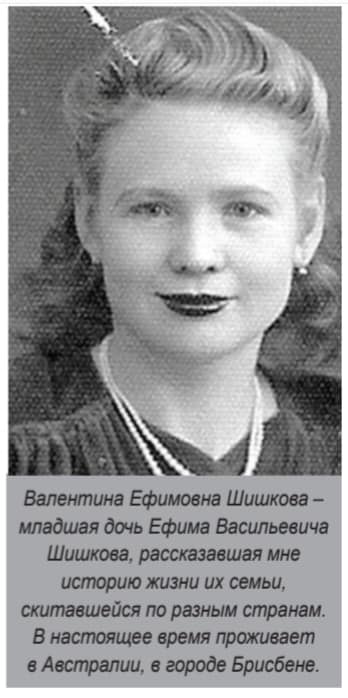 Valentina Efimovna Shishkova was born on February 23, 1927 in Bashkiria, in the village of Preobrazhenovka, Sterlitamak district. At the age of six she became a refugee and left Russia along with her parents, brother and sister. Her father, 33-year-old Efim Vasilyevich Shishkov, forced to flee from repression in 1933 with his young children and pregnant wife Proskovya Timofeevna, leaving home, made a vow to God: if all members of his family remained alive, he would build a temple in which if this were not a point in the world.