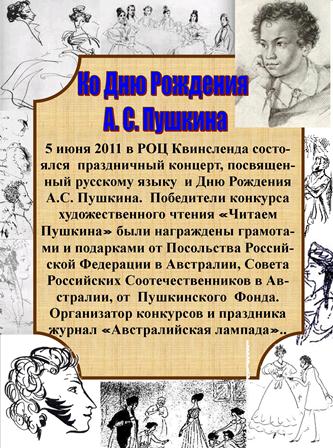 Время не должно стереть память, а расстояния отделить нас от Пушкинской России. Конкурсы, праздники, посвященные А.С. Пушкину, прошедшие в 2011 году в австралийском городе Брисбене – это свидетельство того, что творчествоПушкина актуально и через 212 лет. Пушкин нужен нам и дорог, как и Россия, где бы русский человек ни жил - в России, или за ее пределами. Никто не знает своей судьбы, как и не знал великий поэт.Главное -надо знать и помнить, что мы - православные, что Россия – великая страна, коль Бог ей посылает таких поэтов. Богата русская земляисповедниками, праведниками, мучениками, поэтами.
