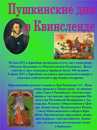 Вначале апреля 2011редакцией журнала «Австралийская лампада»было объявлено о двух творческих конкурсах в Брисбене. Один из конкурсов назывался «Читаем Пушкина». Целью этого конкурса было художественное чтение произведений А.С. Пушкина, инсценировка, сказок. Второй конкурс назывался «Рисуем сказки Пушкина».Как известно, Пушкин не только любил и ценил живопись, но и сам увлекался рисованием. Исследователи нашли большое количество графических набросков на его рукописях.