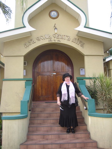 Автор статьи-исследователь русской эмиграции в Австралии на ступеньках Свято-Николаевского собора в Брисбене-первого русского православного прихода на 5-ом континенте, в строительстве которого принимал участие ее земляк из села Чутырь Игринского района Удмуртии, Дмитрий Константинович Анисимов.