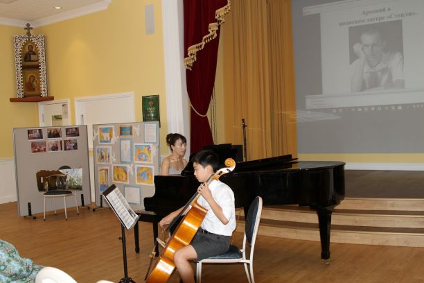 Офицер Белой Армии Арсений Иосифович Савицкий прошел на чужбине тяжелый путь русского беженца. В Шанхае стал работником рекламного агентства, встретил свою любовь и судьбу Елену Старченко из Благовещенска, в Гонконге, в японском лагере стал карикатуристом. Этот период жизни Арсения в Шанхае и в Гонконге прекрасно проиллюстрировала оперная певица Харбинской сцены Синсия Йанг Чен (Yang Chen) и юный виолончелист Натгхан Ли. Главу пребывания Арсения Савицкого в японском лагере «Стенли» вновь озвучивает песней с тоской о Родине Василий Ганьшин. Арсений после японского лагеря в 1945 году попадает в Австралию, в город Брисбен, где не только проявляет себя, как талантливый художник, но и активно участвует в жизни русского общества, как в церковной, так и в светской жизни. Множество ценнейших фотографий, представленных в книге «Гардемарин с чужой судьбой», мы увидели на большом экране Свято-Николаевского собора во время презентации и это сильно впечатляло. В книге включены сцены культурной жизни русского Брисбена 50-ых- 80-ых годов ХХ-го столетия. Иллюстрацию того периода жизни нам вновь продемонстрировали скрипачка Алена Чигуля и пианистка Ирина Проджер.