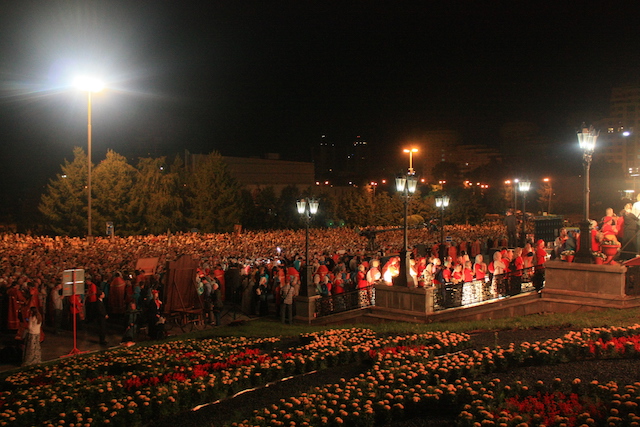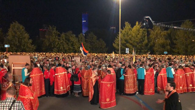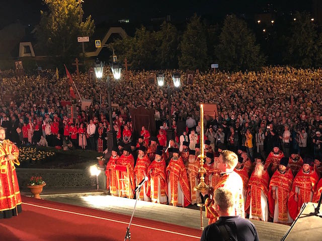 -Для меня это был уникальный опыт, и то, что я испытал во время «царской ночи скорби» в часы шествия, глубокой молитвы, единения духа людей, всеобщего покаяния, я не испытывал раньше никогда. Этих часов свой жизни я никогда не забуду. На место начала крестного хода мы прибыли примерно за шесть часов до ночной службы. Вся площадь была уже занята людьми. Было видно, что многие здесь ночевали. Повсюду, прямо под открытым небом, на расстоянии друг от друга в 50-ти метрах стояли аналои с евангелиями, крестами и люди один за другим подходили к аналоям и исповедовались у священнослужителей. Таких духовных точек для исповеди прямо на площади было организовано около 30-ти. Исповедь прямо на улице меня просто потрясла. Люди шли и шли, но самое важное потрясение было еще впереди. Забегая вперед, чтобы обратить внимание на то, сколько прибыло народа в ту ночь, я хочу сказать, что в храме причащались только священнослужители. Одних архиереев прибыло около 40. Невозможно было всем войти в храм. Священнослужителей прибыло столько, что чаш с Божественными дарами было приготовлено для них около 20. Верующие миряне причащались под открытым небом из 100 чаш. Я такого никогда не видел. Как все это надо было мудро устроить с бытовой и с духовной точки зрения, а так же предусмотреть с точки зрения безопасности.
