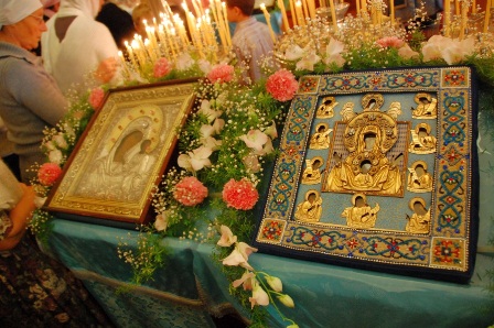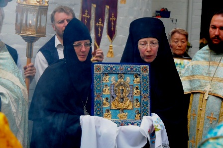 Торжественная служба, звон колоколов, счастливые улыбки прихожан, заботливые глаза сестер Святой обители – все это было в тот благодатный день. Ощущался единый духовный подъем, и благодарность Богородице. Ангелы под куполом пели Херувимскую, поддерживая хор. Во время крестного хода люди вышли на улицу с множеством святых икон и хоругвей. Капли святой воды слетали с кропил двух владык, окропляя живительной силой верующих. Игуменья Казанского женского монастыря Марияи игуменья Введенского женского скита Анна впереди всех несли Чудотворную икону Одигитрии.