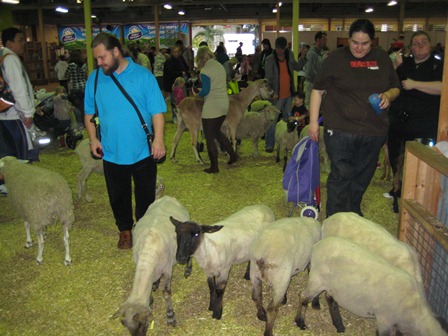 В павильоне шерсти встречают нас опять белоснежные овцы разных пород, иногда похожие на бобтейлов. Тычутся носом в сумки в поисках гостинца. Везде продается корм за 2 доллара: зерно, сено, семечки - в зависимости, в какой загон заходишь. Животные ждут тебя с гостинцем.Некоторые ограничить себя не могут и от переедания и усталости лежат в углах, не двигаясь.