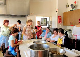 Сразу попадаем на кухню, где восьмерки в воздухе делают наши очаровательные хозяйки. Ароматом манят всевозможные начинки для пирожков и блинчиков.Уж которые сутки на вахте наши кулинарные искусницы, а посмотрите, как выглядят, как будто бессонных пред фестивальных ночей и не было.