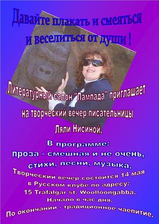 Музыкально – поэтический салон «Лампада» приглашает на встречу с писательницей Лялей Нисиной. Встреча состоится 14 мая 2011 в 1 час дня в Русском Клубе Брисбена.
