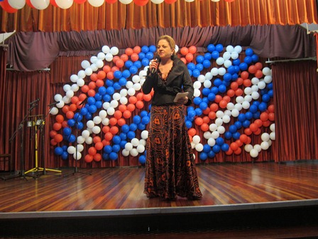 Зал был сегодня по – праздничному украшен российским флагами, шарами. Звучала музыка, нарядные люди гуляли по центру, поздравляя друг друга с Днем России и со Святой Троицей.