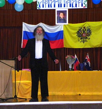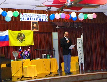 Отец Гавриил, как всегда,очень содержательно составил свою речь о значении пушкинского мероприятия в Квинсленде и о важности Пушкина вмировой литературе.После выступленияредактор журнала передала микрофон для ведения праздничной программы вице председателю Пушкинского Фонда Квинсленда Николаю Ивановичу Дмитровский – Байкову, который короткорассказал о творческом пути А.С. Пушкина и приступил кобязанностям конферансье.