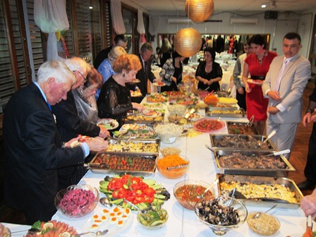 - Свадьбы проходили каждую пятницу. Иногда было столько заявок, что одновременно праздновалось три свадьбы в один вечер.Все накрывалось по-русски: Все на столе, ешь, сколько хочешь, и когда захочешь. Только лет пять назад стали угощения ставить на отдельный стол и гости стали стоять в очередях с тарелками. Зато так меньше выбрасывается продуктов и хозяйкам проще ухаживать за гостями.