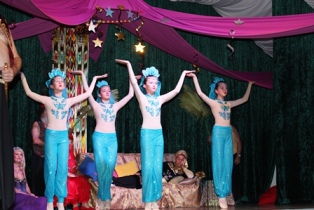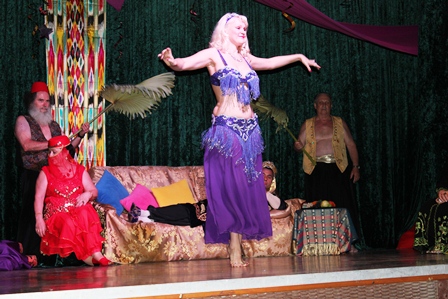 События на сцене разворачивались стремительно, раскрывая зрителям сюжет музыкальной восточной сказки. Главную роль - падишаха играл Ариф Исмаилов, который, неожиданно, раскрыл свой артистический талант. Свита падишаха была важной и непреступной. Пытаясь развеселить скучающего властелина, на сцене один за другим менялись сказочные персонажи. Танец 'Восточные фрески' исполнили солистки студии 'Максимо' под руководством Ольги Шикиной: Маша Тюкавкина, Нина Судницына, Тоня Войтенкова, Саша Пешкова.