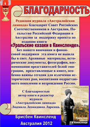 благодарит Совет Российских Соотечественников в Австралии, Посольство Российской Федерации в Австралии за поддержку проекта по изданию книги «Уральские казаки в Квинсленде».