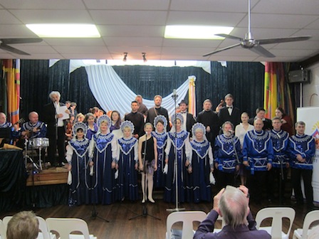 Гимн России, который исполнил мужской объединённый хор четырёх русских православных церквей Брисбена. Хор в таком составе на сцене Русского Общественного Центра выступил впервые. В течение всего концерта в исполнении вновь созданного хора прозвучало духовное песнопение, песни гражданской тематики и, конечно же «Бородино» на слова Михаила Лермонтова. Торжественно прозвучал марш «Прощание славянки», вливавшийся в душу то тоской расставаний, то радостью побед. Написанный в 1912 году русский марш «Прощание славянки» штаб-трубачом 7-го запасного кавалерийского полка Василием Ивановичем Агапкиным до сих пор остаётся популярным, как в России, так и за рубежом и зрителями в Брисбене был принят с большой благодарностью. Надо отметить, что квинслендцы с большим восторгом приняли новый духовный хор, в состав которого вошли необыкновенной красоты мужские и женские голоса. Руководитель хора диакон Владимир Бигдан.