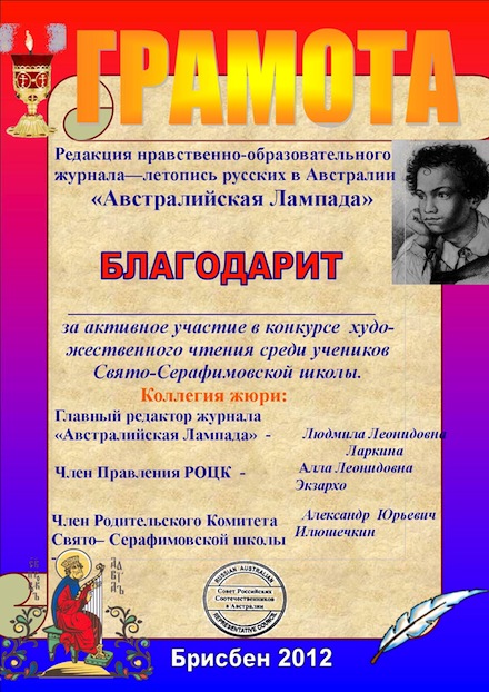 В сентября 2012 в Свято – Серафимовской школе Брисбена прошёл внутри школьный конкурс художественного чтения. Организаторами конкурса явился педагогический коллектив школы во главе с завучем Светланой Трефиловой. В члены жюри были приглашены: главный редактор журнала «Австралийская Лампада» Л. Ларкина, член комитета Русского Общественного Центра Квинсленда А. Экзархо и член родительского комитета школы А. Илюшечкин.