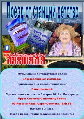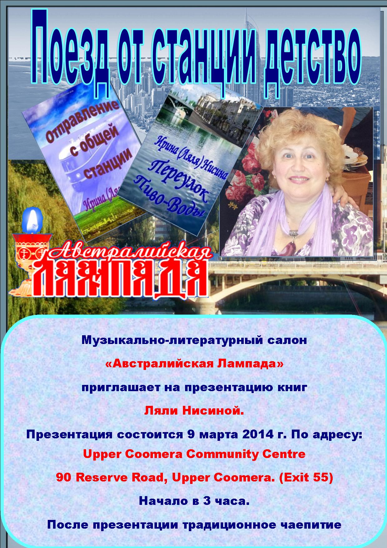 Вы познакомитесь с творчеством писательницы с Голд Коста Ирины (Ляли) Нисиной. У Ляли вышли в свет две книги! Книги расскажут вам о Виннице и Жмеринке, Москве и Ленинграде, Ленкорани и Лондоне, Санкт Петербурге и Мельбурне, Голд Косте и Челябинске. Из русского Харбина герои книг перенесут вас в маленький город Камень-на-Оби и в Брисбен, на набережную Серферс Парадайз и на Сиреневый бульвар в Москве.