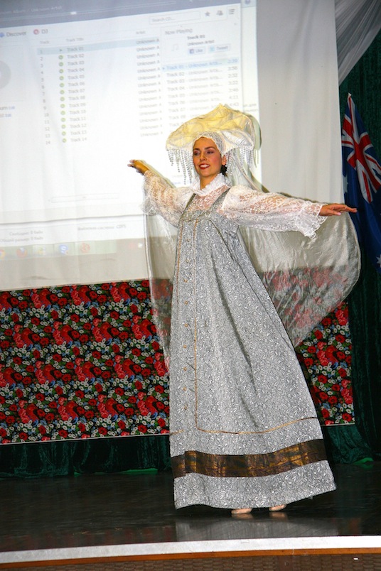 Рассказ о истории славянского костюма был проиллюстрирован выступлениями талантов штата Квинсленд. Прозвучали весёлые украинские песни в задорном исполнении Инессы Макинтайр под аккомпанемент замечательной скрипачки Алёны Чигуля. Молодые красавицы Инесса и Алена были в великолепных украинских костюмах.