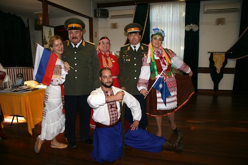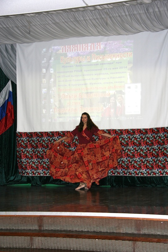 В русском костюме пела песни о России Наталья Семенеева. Образ певицы был созвучен с образом России. Русские песни прозвучали, также, в исполнении Арсения Хлыновского. Казачьи песни пел казачий атаман из Сиднея Семен Бойков. А, как замечательно танцевала Лиза Сеги! Танец «Катюша» - в ярком, народном платье озорной, весёлой Катюши. Классический танец «Лебедушка» - в белом длинном платье, задумчивой красавицы. Образ танцующей «Цыганочки» - также, был неотразим.