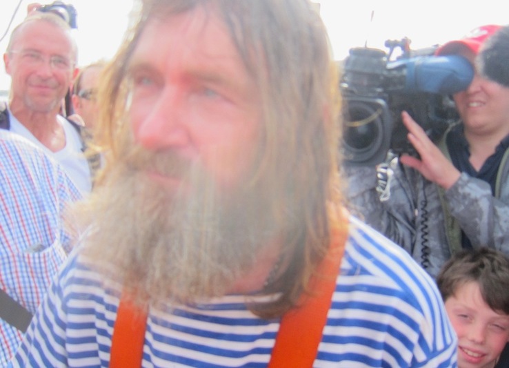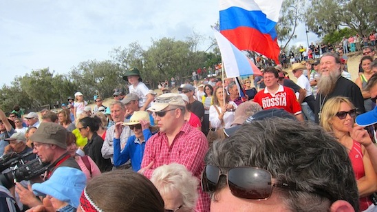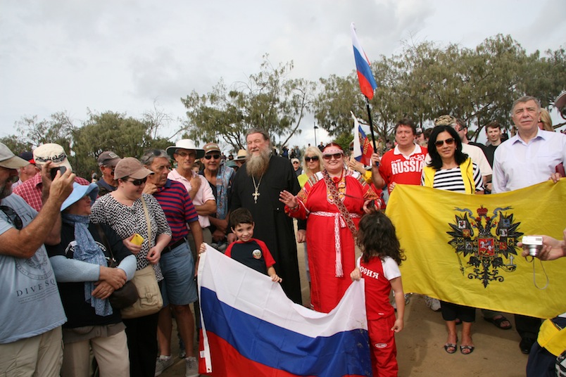 В течение двух суток ориентировочное время прибытия путешественника менялось несколько раз. Все зависело от погоды, ветра, волн. Чтобы не пропустить знаменательного события, многие прибыли на побережье океана в Moolloolabaв субботу 31 мая в8 часов утра. Так же сделали и мы с группой друзей из Брисбена и его пригородов. После ночного дождя, погода стояла настолько ясной и солнечной, что многочасовое ожидание было совершенно неутомительным, а по – настоящему радостным. Соотечественников объединял какой-то дух радости, гордости за знаменитого россиянина. Подходили австралийцы, намеренно приехав отовсюду. Оставались ожидать и те, кто пришёл ранним утром погулять по солнечному пляжу и, узнав об этом событии, остался ожидать вместе с остальными. Пляж был переполнен людьми с Российскими флагами и флагами российской Империи с гербом Георгия Победоносца. Люди в знак преданности России пришли в русских национальных костюмах. Корреспонденты разных радиостанций и телевидения брали интервью и снимали фильмы.