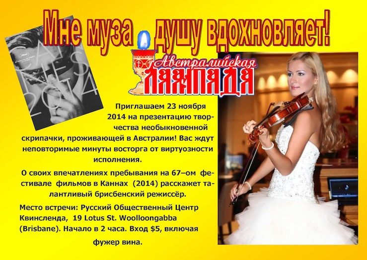 Приглашаем 23 ноября 2014 на презентацию творчества необыкновенной скрипачки, проживающей в Австралии! Вас ждут неповторимые минуты восторга от виртуозности исполнения.