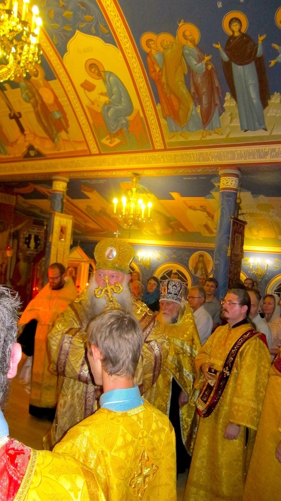 Несмотря на рабочий день и на проливной дождь, на вечернюю службу в собор приехало много народа. Первая престольная всенощная после установки нового иконостаса, совершалась под грохот грома, сияния молний и стука по крыше непрерывного дождя. Двери в соборе открыли настежь. Разгулявшаяся непредсказуемая стихия, которая около трёх недель назад, уже побушевала в соборе, разбив более 30-ти окон, -никого не пугала. Скорее, это буйство природы и открытые двери на встречу грозе, придавали собору еще более непоколебимую духовную мощь и веру в таинственную силу молитвы. Всенощную службу вёл епископ Пётр Кливлендский из США в сослужении настоятеля Свято-Николаевского собора протоиерея Гавриила Макарова, благочинного по штату Квинсленд митрофорного протоиерея Михаила Клебанского и другого брисбенского духовенства.