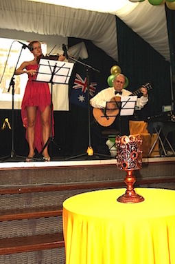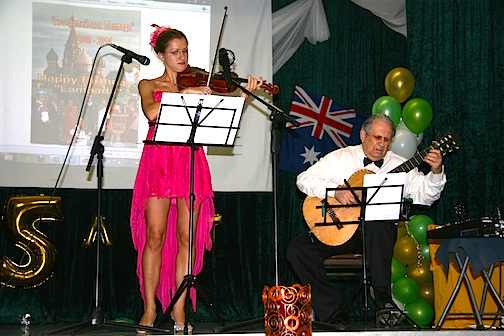 Зал Русского Общественного Центра Квинсленда был необыкновенно красиво украшен профессиональным дизайнером. Через всю сцену протянулась арка из воздушных шаров зелёного, жёлтого и белого цвета. На столах горели свечи и поднимались к потолку тумбы шаров золотого отлива. Зал шарами украсила Ольга Лунина, и конечно же, не без помощи неутомимых лампадовцев.