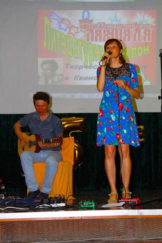 Дальше завораживающей песней в исполнении Ольги Богдановой на стихи Людмилы Ларкиной началась литературно-музыкальная композиция. По экрану проплывали титры участников встречи, обложки журналов «Австралийская Лампада», обложки книг редактора журнала. Ведущие Людмила Ларкина и Ляля Нисина рассказали гостям историю рождения журнала-летописи и постоянно работающего при нем уникального творческого салона. Идея появления в Австралии объединения, в котором участвуют многие талантливые певцы и музыканты, художники и писатели, объединённые одной задачей-сохранить и донести живой русский язык и русскую культуру в непростых условиях эмиграции, принадлежала поэту и писателю Людмиле Леонидовне Ларкиной .