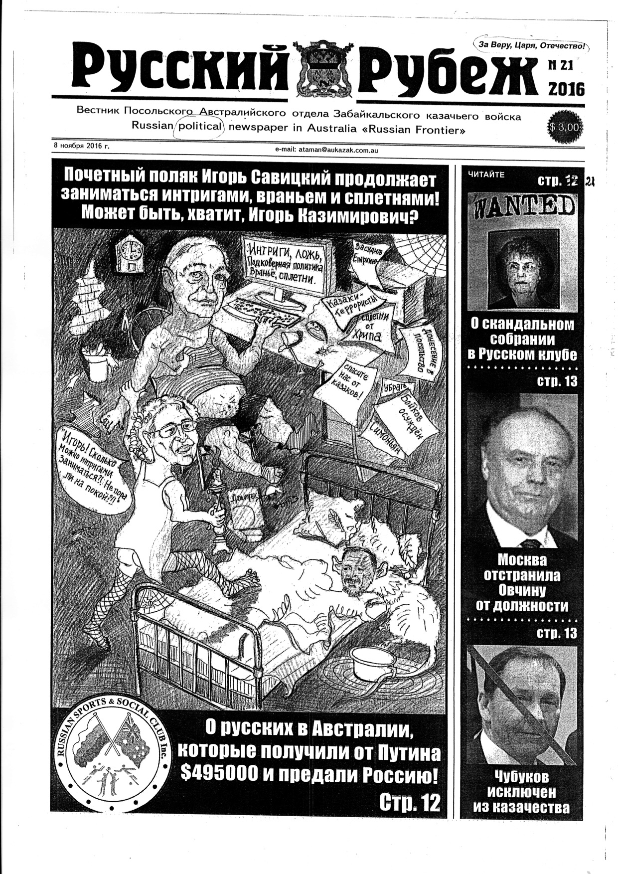 Вестник Посольского Австралийского Забайкальского казачьего войска «Русский рубеж» №21 от 8 ноября 2016 года уже несколько раз облетел электронное пространство Фэйсбук и других сайтов. В газете опубликованы статьи, порочащие лучших представителей русской общественности в Австралии, а у русскоязычных читателей не возникло ни одной реакции противостояния. Русские люди, это же позор всем нам, когда, читая в газете на русском языке за границей статьи с грязными заголовками против наших же соотечественников, мы молча пересылаем информацию друг другу. Кто-то при этом смакует, кто-то тихо, чтоб никто не слышал, возмущается.