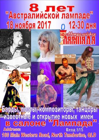 Уходящий 2017 год для творческого коллектива «Лампады» был очень плодотворным. 15 января был организован «Свободный микрофон", который проходит в «Лампаде» ежегодно с целью знакомства с новыми талантами Квинсленда. 12 февраля прошли северянинские чтения, посвященные 130-летию со дня рождения поэта серебряного века Игоря Северянина. 19 февраля был организован творческий вечер "Знакомый ваш Сергей Есенин"- незабываемая встреча с Рустемом Галичем – с русским актером и режиссером из Америки. В его программе великолепно выступили певица Лариса Бруккер и танцовщица Анна Шевель. Встреча «Искусство владения речью" с Еленой Герман состоялась 19 марта. К празднованию Дня победы была поставлена литературно-музыкальная композиция "Молодежь против войны". 5 июня прошла встреча с искусствоведом из Хабаровска Ольгой Монаховой по теме "Этикет, как искусство общения". 20 мая состоялся романтический вечер на Баварском Дворе "Ты-мое вдохновение". 10 июня в городе Мулумбимби штата Юэный Уэлс редакция журнала «Австралийская лампада» организовала встречу с мужским, австралийским хором «Dustyesky», исполняющим песни на русском языке. 26 августа в австралийском Этническом Центре культуры Квинсленда состоялась презентация книги Людмилы Ларкиной "Фарфоровый Ангел". В ноябре наш творческий коллектив организовал празднование 8-летия «Лампады», который получился ярким и незабываемым. Завершится творческих 2017 год для коллектива «Лампады» «Свободным микрофоном» с поэтическими чтениями и песнями под гитару в воскресенье 17 декабря у водопадов горы Тамбурин.