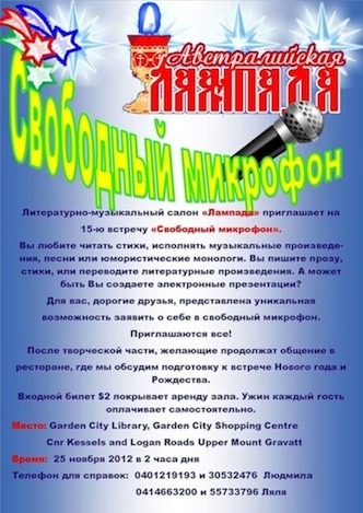 25 ноября 16-ая встреча в музыкально – поэтическом салоне «Лампада» в Брисбене «Свободный микрофон».