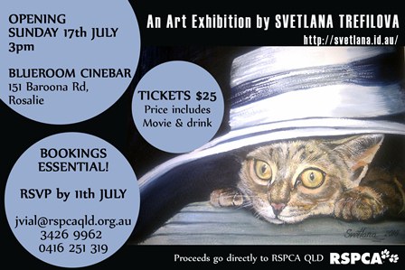 Мы рады пригласить вас на открытие персональной художественной выставки Светы, которое состоится в воскресенье, 17 июля в 3 часа дня. Это первое в ее артистической карьере событие такого уровня. На выставке будут представлены работы последнего года, в основном – акварели, acrylic и mixed media. Выставка проводится при участии RSPCA и для их поддержки, выручка от продажи входных билетов и часть выручки от продажи картин отправится в фонд RSPCA, их центр в Fairfield сильно пострадал от наводнения. Так что, посетив открытие, вы не только морально поддержите Свету, но и материально - еще одно достойное дело. В соответствии с тематикой RSPCA, многие из работ на выставке посвящены животным и живой природе.